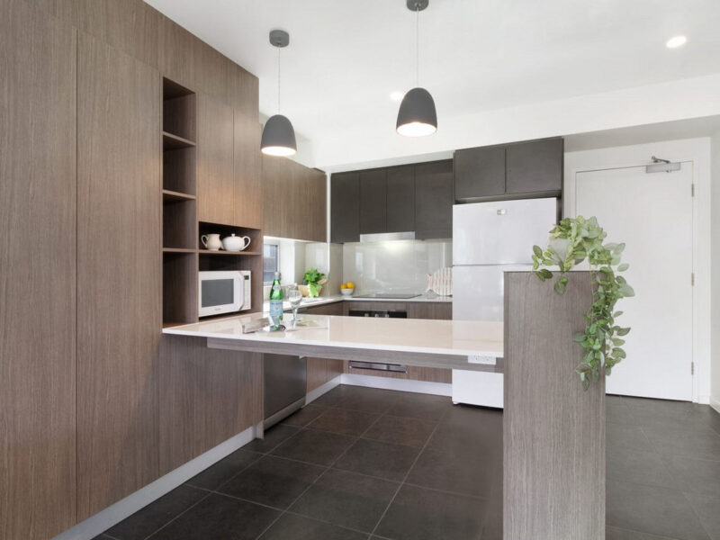 Modern kitchen with stone benchtop & stainless steel appliances