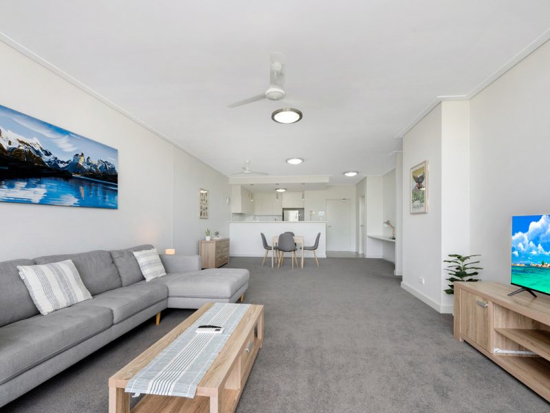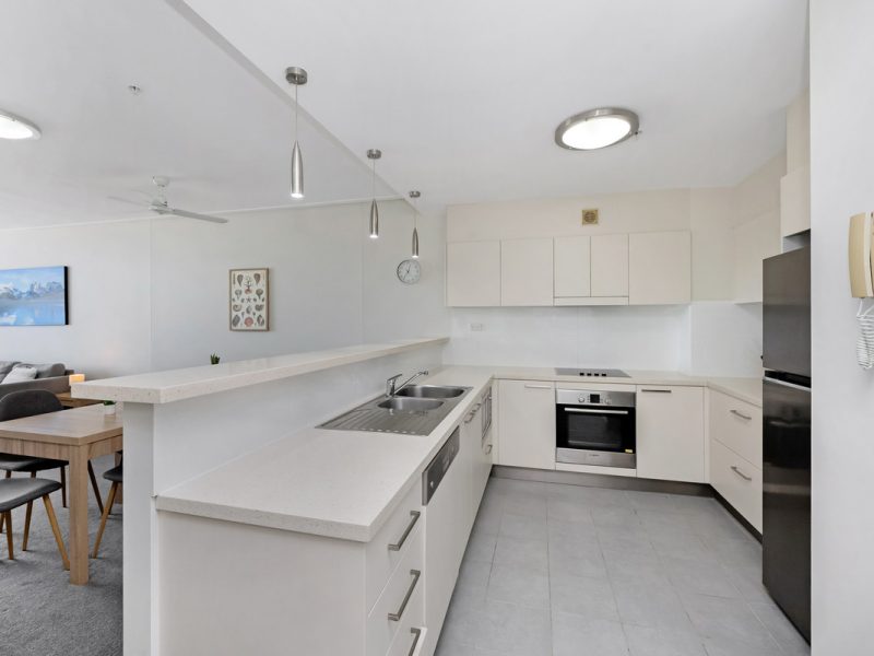 With Coastal Sea breezes flowing through the immaculate open plan Apartment, being located on the Eighth level, boasts City, Ocean and Marina views, and is the ideal setting to relax after a busy working day. Entering the apartment, you will be pleasantly surprised at the space this Apartment has on offer; with the open plan living area, including an office nook, the spacious kitchen which includes all the mod cons to entertain friends and family, and sliding glass doors off both bedrooms leading to the undercover balcony to sit and enjoy the tranquil night views.